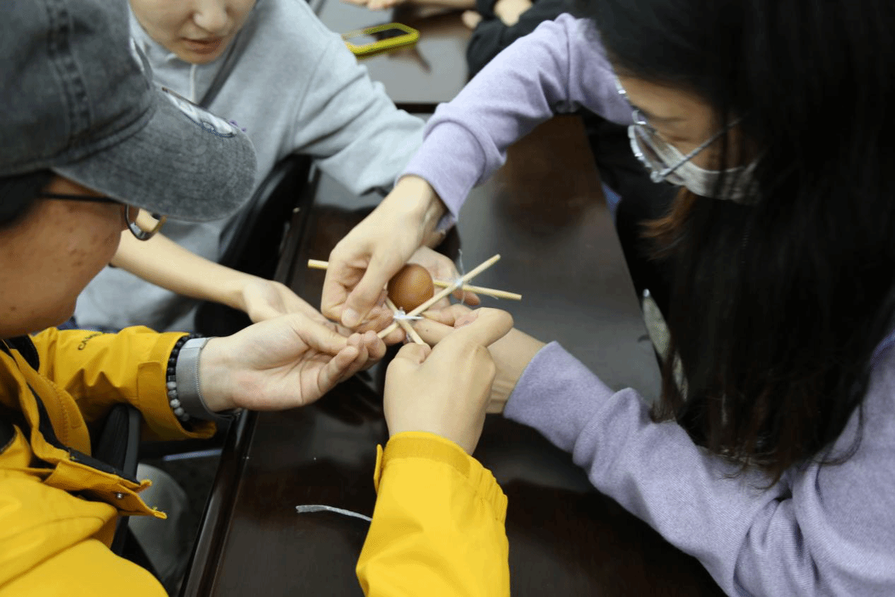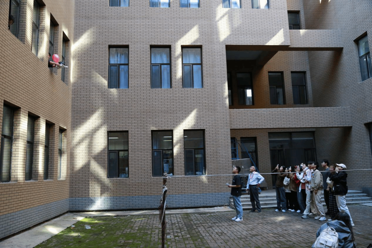 “高空飞蛋”项目则聚焦创新思维与实践能力,要求各小组设计保护装置,让鸡蛋从不同楼层高处坠落而不破损。项目灵感源于“三自”教育中“自我发展”的创新要求,也贴合专业教育中科研问题解决的思维培养目标。指导教师从结构设计逻辑、材料利用效率等角度提供建议,鼓励新生跳出固有思维。有的小组采用“多层缓冲+重心稳定”方案,有的结合经济管理学科成本控制思维优化材料使用,最终80%的小组成功完成挑战。事后分享中,来自工业工程与管理专业的新生表示:“这个项目像一次‘微型科研’,让我更懂‘创新不是空想,而是有方法的实践’”。