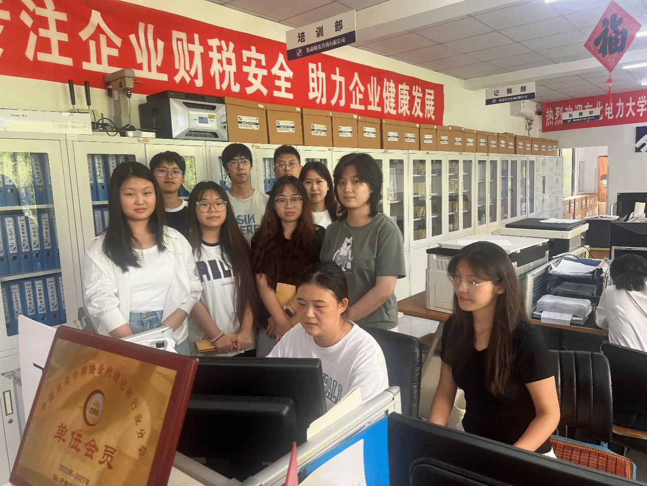 校外财务公司实习部分,同学们亲身体验了人工智能在财务场景中的应用,并深入学习了票据处理、印章管理、凭证装订等日常业务操作以及税务局、银行等部门实地办理业务、开票、报税等。